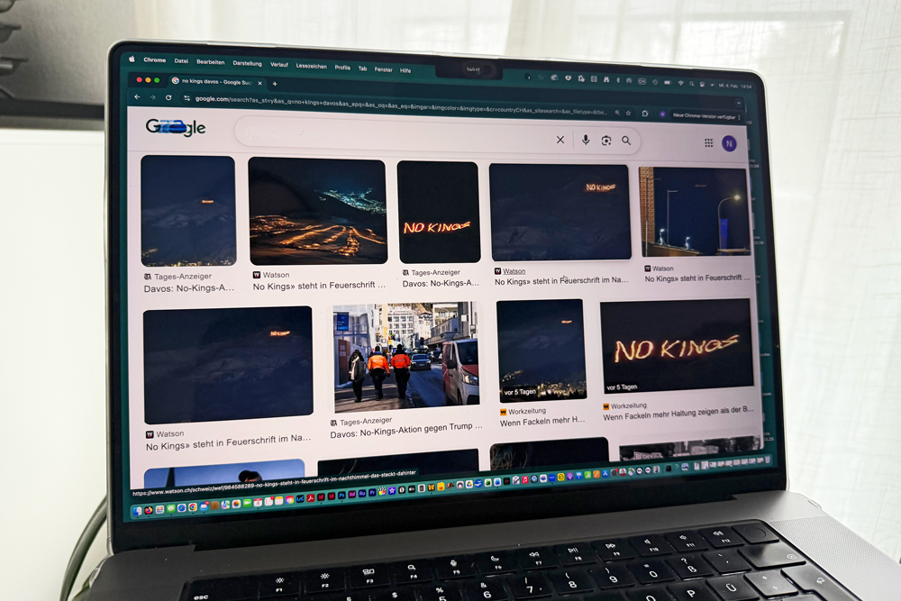 Während des World Economic Forum WEF schrieb eine Gruppe von Aktivisten mit 450 Fackeln die Parole «No Kings» in den Schnee auf dem Grüniberg oberhalb Davos. Die Botschaft, die sich auf den US-Präsidenten Donald Trump bezog, wurde unten in Davos sofort verstanden. Weltweit berichteten die Medien über die Aktion.