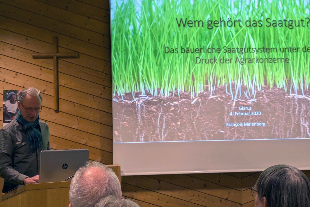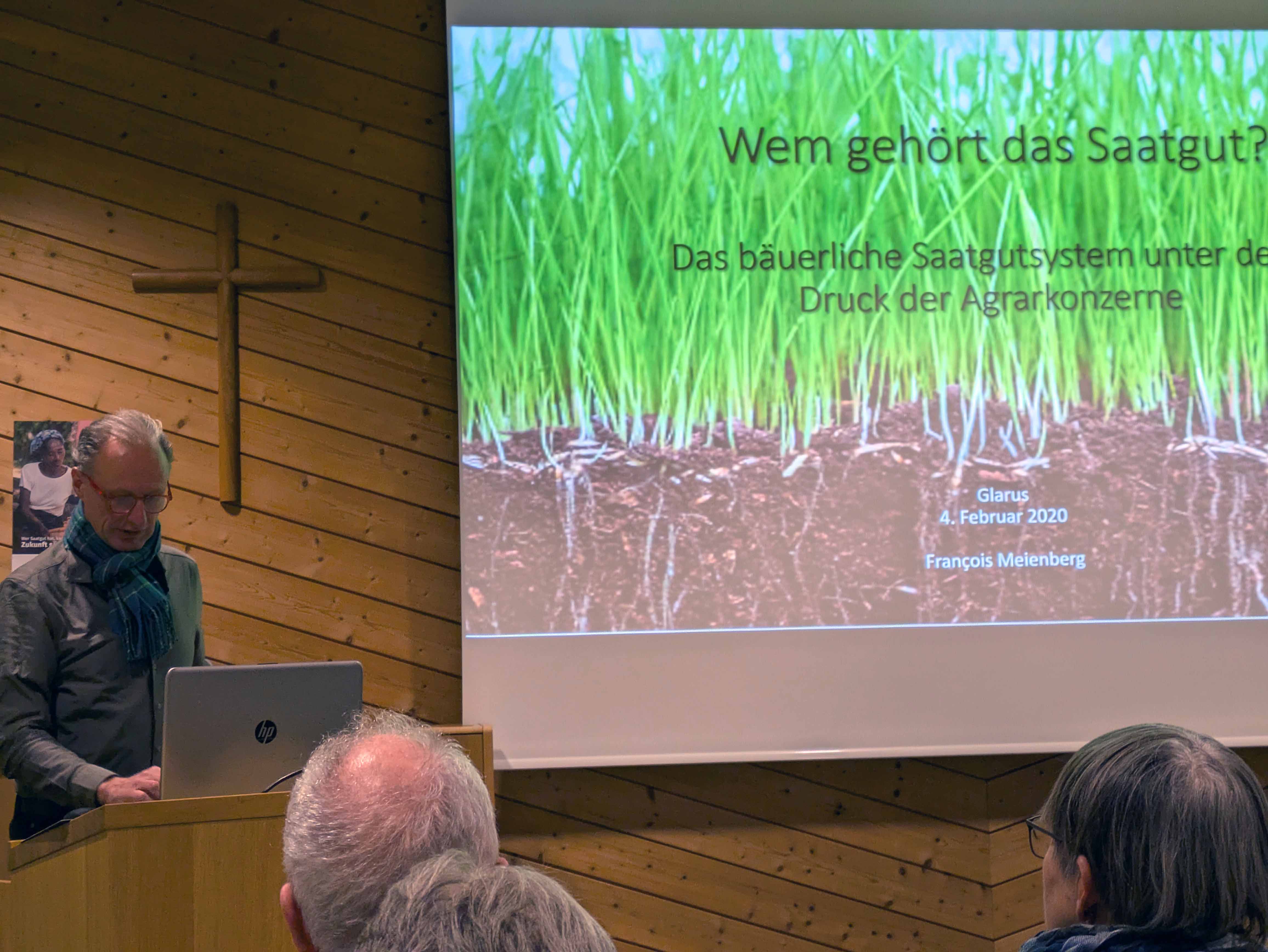 Deren Auftakt bildete nun der Einführungsabend, der auch heuer von der Kommission für Ökumene, Mission und Entwicklungszusammenarbeit (OeME) der reformierten Landeskirche organisiert wurde. Am 20. Januar begrüsste deren Vorsitzende, Pfarrerin Martina Hausheer-Kaufmann das Publikum – übrigens zum letzten Mal vor ihrer Pensionierung im Frühsommer. Nach der Vorstellung des Kampagnenmaterials durch Beat Züger (Beauftragter Missio & Fastenaktion Kanton Glarus) folgte ein informativer Apéro. Die von Susanne Hirschi vom CLARO Laden Glarus dargebotenen Produkte haben nämlich einen direkten Bezug zum Thema – indem dieses Angebot ebenfalls kleinbäuerliche Initiativen unterstützt, die für den Erhalt raren Saatguts etwa in Ländern Lateinamerikas oder Afrikas sorgen. So kann die Konsumentin Einfluss nehmen.